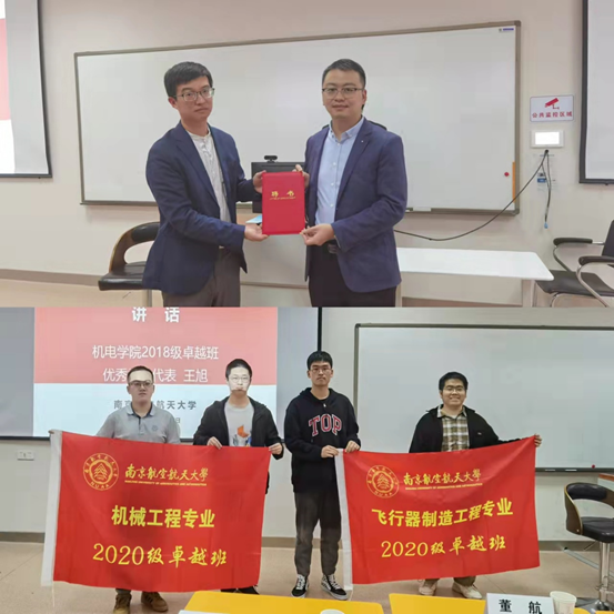 典礼最后,朱海华为“卓越班”班主任段晋军颁授聘书,康泽源和董航为两个“卓越班”授予班旗,授旗仪式的完成代表着机电学院“卓越班”正式组建。在师生们热烈的合影留念中,机电学院2020级“卓越工程师教育培养计划”专业“卓越班”开班典礼圆满落幕。