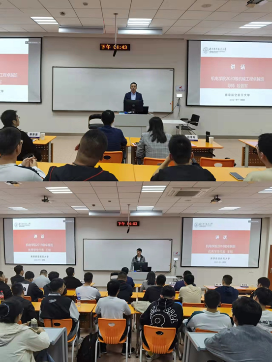 11月4日下午,机电学院2020级“卓越班”开班典礼在将军路校区5101举行。本次活动邀请了菲舍尔航空部件镇江有限公司工程中心副主任乔巧玲、仅一联合智造有限公司人事经理束玲、机电学院本科教学副院长于敏、机电学院院长助理朱海华、校团委挂职副书记2020级“卓越班”班主任段晋军、长空学院2020级辅导员康泽源、机电学院2020级辅导员董航、机电学院本科教学秘书熊萍萍、2018级“卓越班”优秀学生代表王旭以及2020级机械工程专业“卓越班”与飞行器制造工程专业“卓越班”的全体同学。典礼由2020级“卓越班”辅导员戚昊主持。