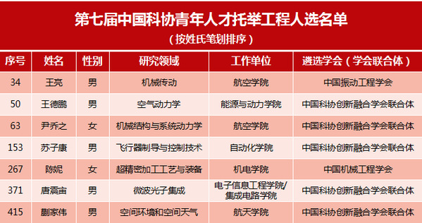 近日,中国科协公布了第七届中国科协青年人才托举工程入选者名单,我校航空学院王亮副研究员、航空学院尹乔之副研究员、能源与动力学院王德鹏研究员、自动化学院苏子康副研究员、电子信息工程学院唐震宙副研究员、机电学院陈妮副教授、航天学院蒯家伟讲师等7名青年教师入选,创历史新高。截止目前,我校已有24名青年教师入选中国科协青年人才托举工程。