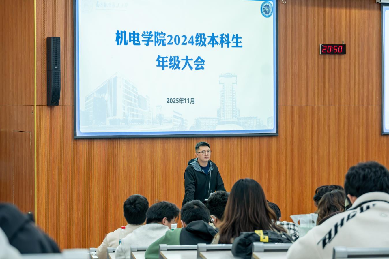 为引导大二学生明确学业定位、激发成长动力、筑牢安全防线,11月10日,机电学院组织召开2024级本科生大二学年主题年级会。学院党委副书记赵铮、校保卫处李广、陈欢,辅导员王小珂、王青,以及全体2024级本科生共同参与会议。