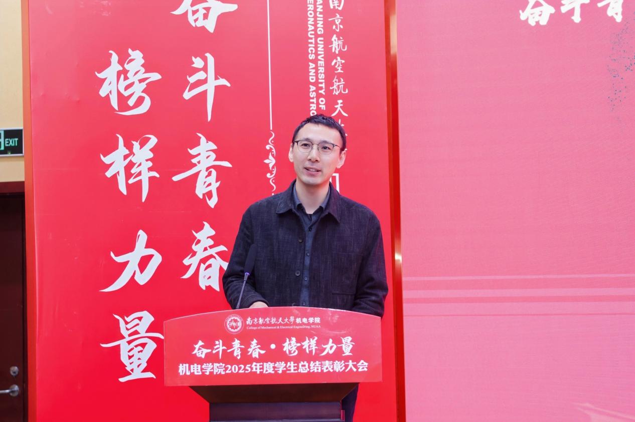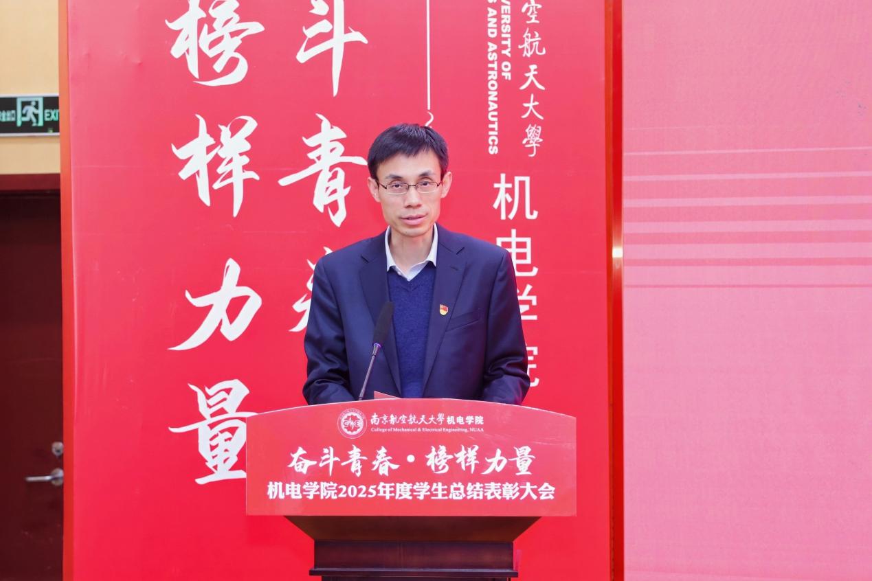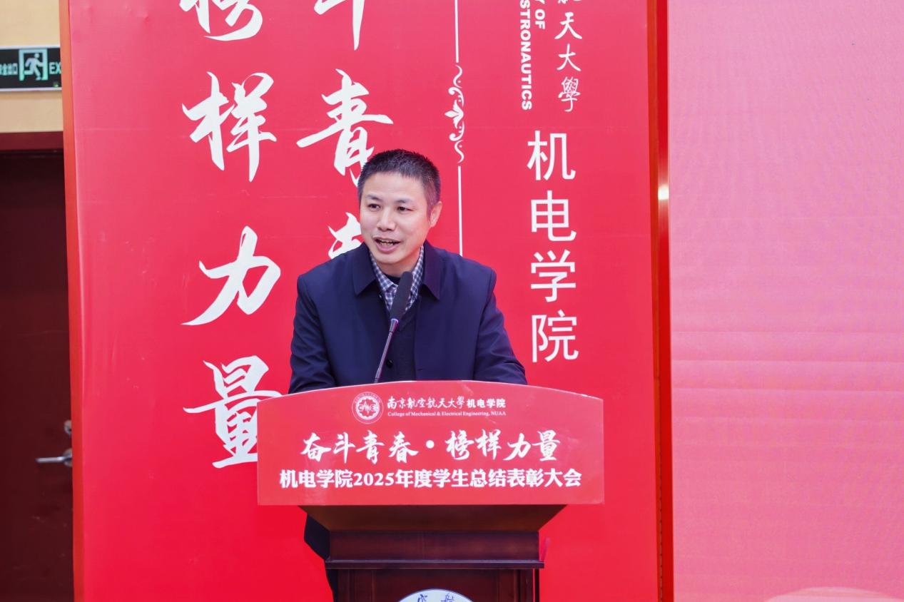 大会最后,机电学院党委书记刘虎作总结讲话。他代表学院向获奖集体与个人表示祝贺,向设奖单位及校友表示感谢。刘虎书记指出,本次大会既是一次榜样事迹分享会,也是一堂生动的思政公开课。他勉励全体机电学子要铸牢信仰之基,将个人理想融入国家航空航天事业大局;要锤炼过硬本领,勇于攀登科技高峰,助推高水平科技自立自强;要永葆奋斗之姿,勇担时代重任,在推进强国建设、民族复兴的伟大实践中书写无愧于时代的青春篇章。