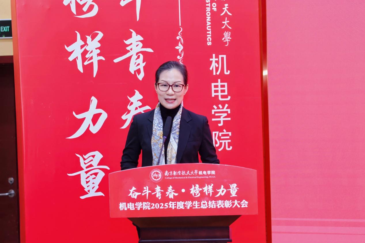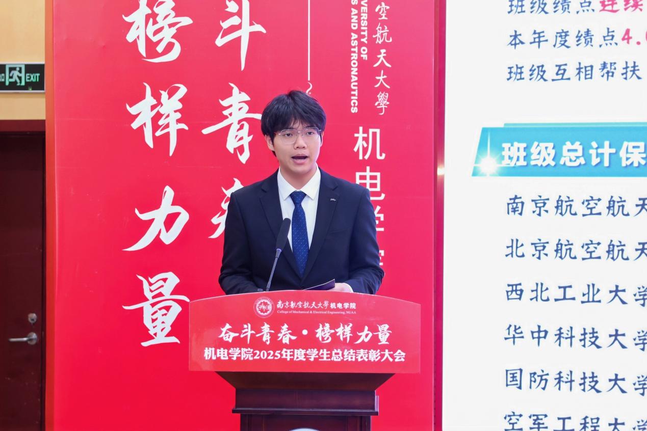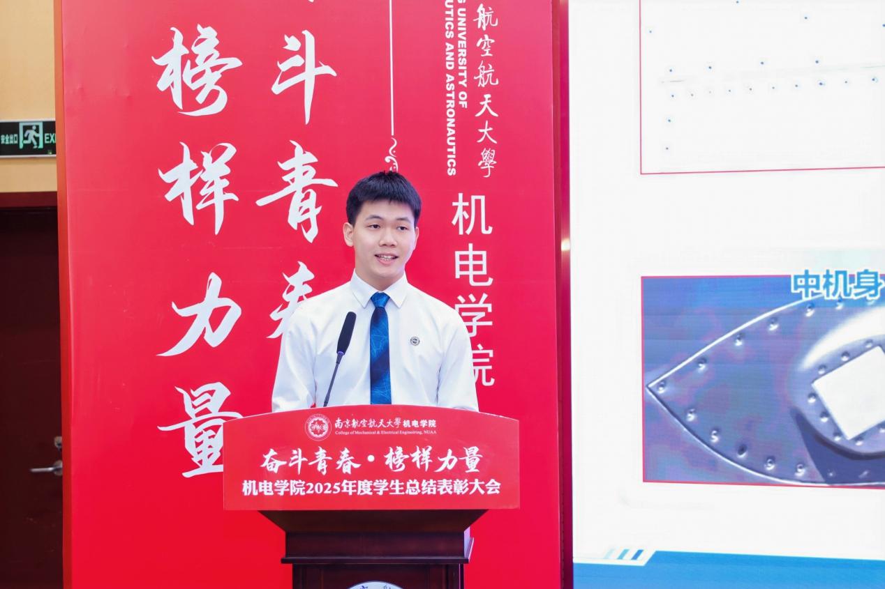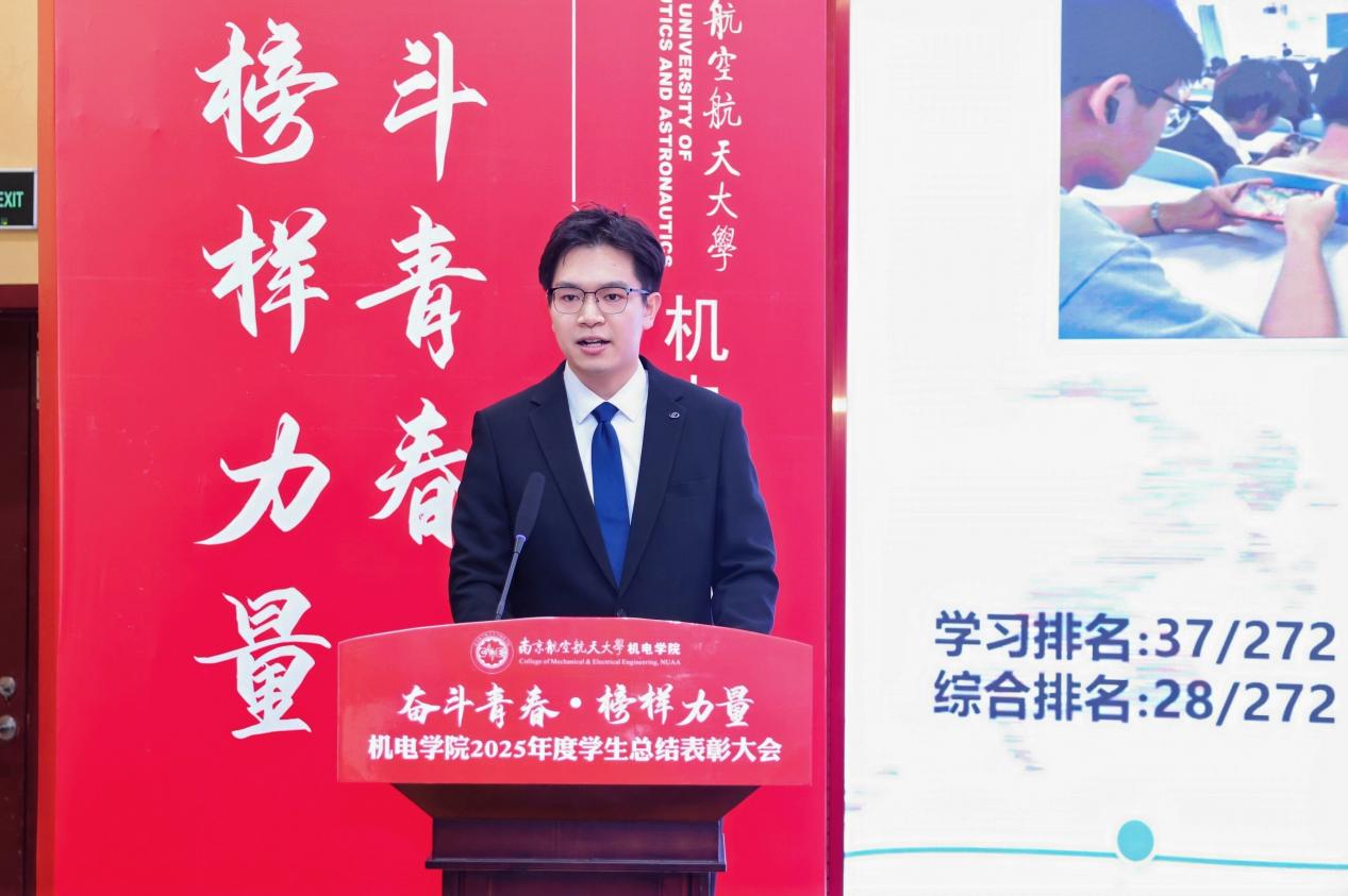 大会最后,机电学院党委书记刘虎作总结讲话。他代表学院向获奖集体与个人表示祝贺,向设奖单位及校友表示感谢。刘虎书记指出,本次大会既是一次榜样事迹分享会,也是一堂生动的思政公开课。他勉励全体机电学子要铸牢信仰之基,将个人理想融入国家航空航天事业大局;要锤炼过硬本领,勇于攀登科技高峰,助推高水平科技自立自强;要永葆奋斗之姿,勇担时代重任,在推进强国建设、民族复兴的伟大实践中书写无愧于时代的青春篇章。