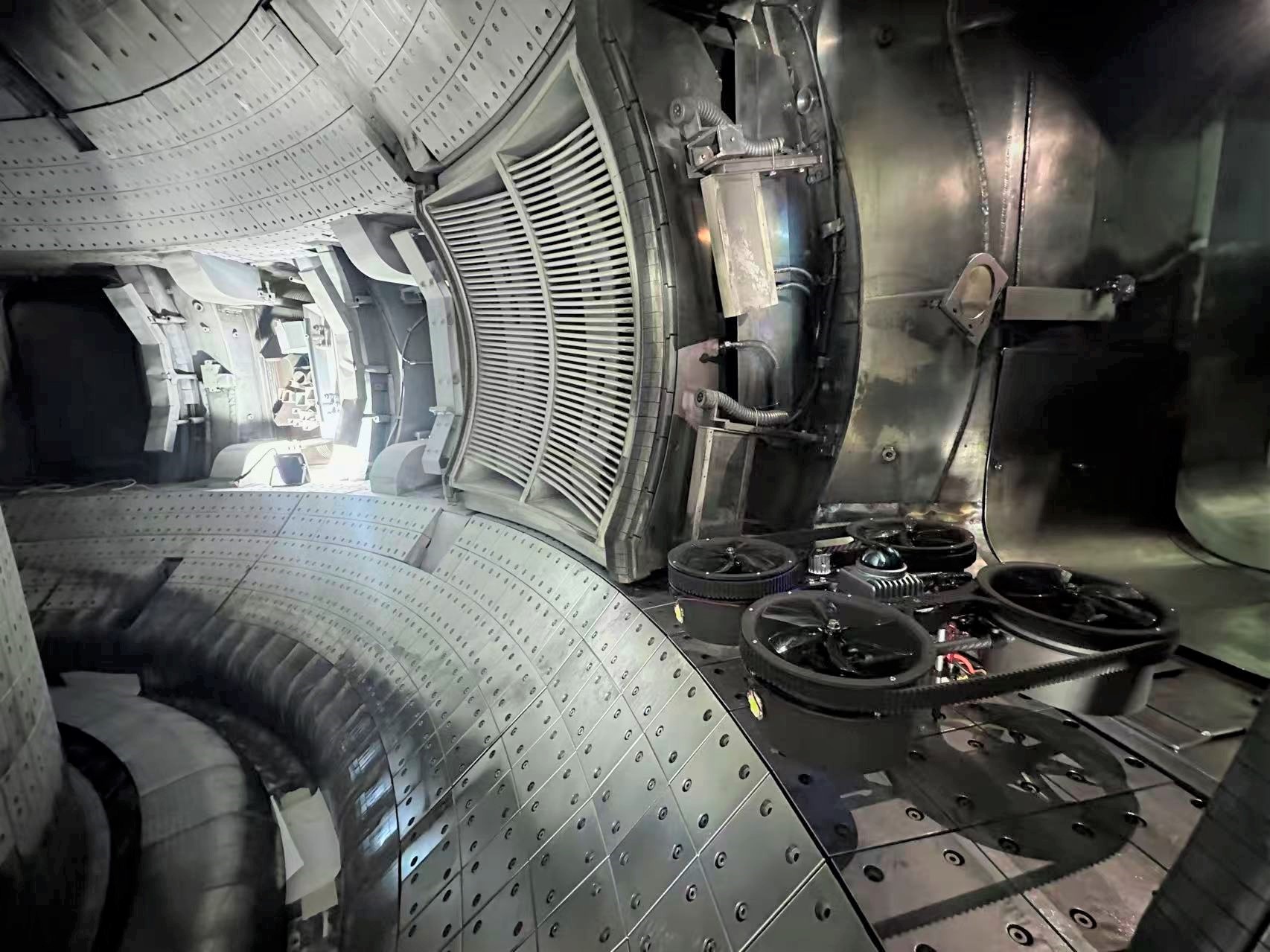 科研攻关从来不是一帆风顺的坦途,更多的是在无数次失败中摸黑前行、在反复试错中寻找方向的坚守。三年时间里,徐友直和团队成员在实地探索中,一步步梳理出堆内环境的四大核心挑战:极限狭窄的空间与辐射,构成了难以逾越的“生存禁区”;环状腔体里的复杂气流,极易引发飞行器失控的“扰动陷阱”;金属四壁的高反光与内部的低照度,让机器人陷入“感知黑洞”;而全封闭的结构,更是让科研人员难以掌控的“认知盲区”。简而言之,传统机器人在这样的环境中,往往面临“进不去、扛不久、飞不稳、看不清”的窘境,每一个难题,都是一道难以啃下的硬骨头。
