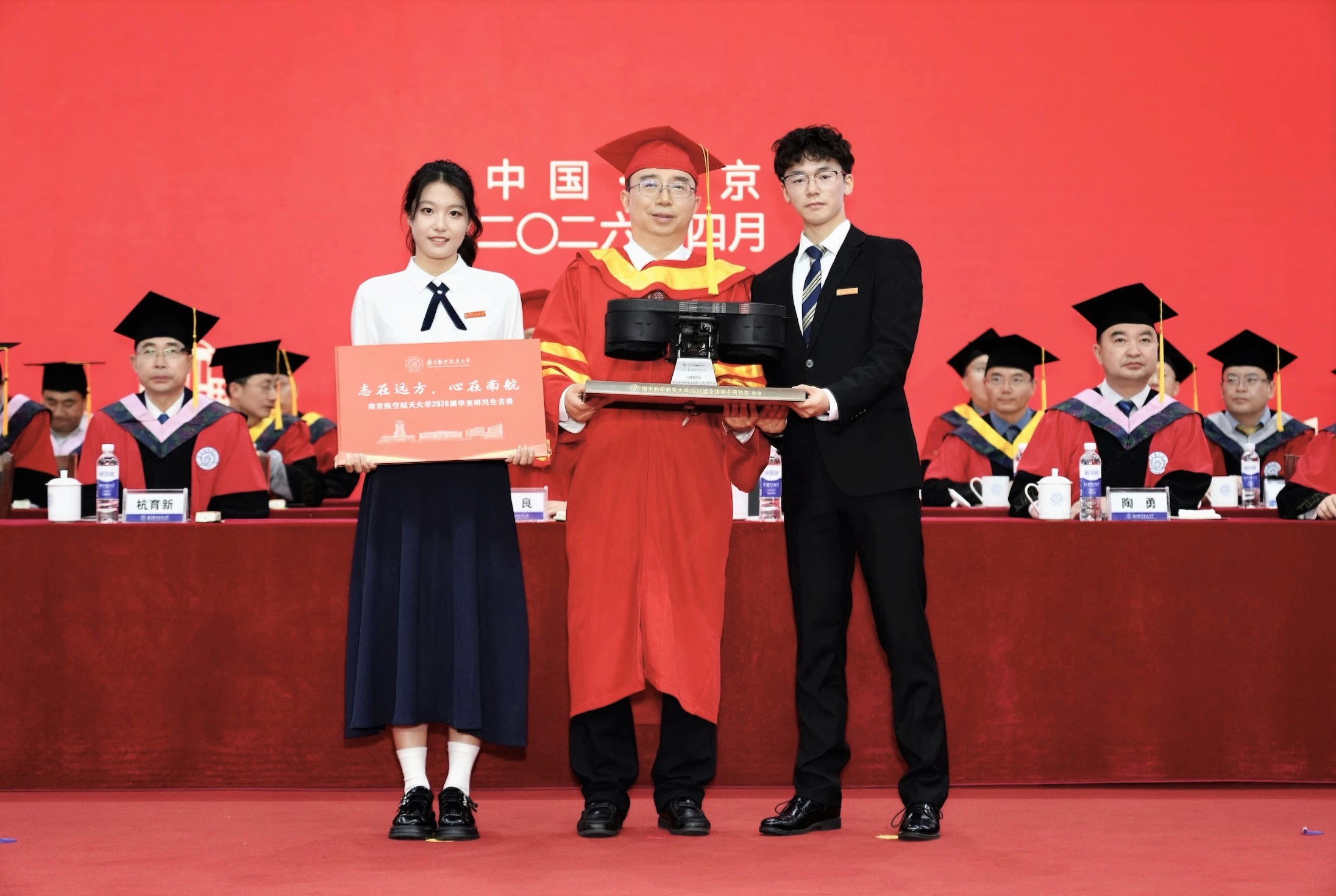 南京航空航天大学2026届研究生毕业典礼上,一份承载着青春赤诚与科研热忱的特殊礼物,温暖了整个毕业季。机电学院运动仿生与智能机器人实验室的徐友直同学,代表全体毕业生,将一台由团队自主研发的“凌聚Ⅱ”无人飞行器,郑重递到姜斌校长手中,该作品在第七届中国研究生机器人创新设计大赛中荣获全国一等奖。介绍间,这台原本折叠的飞行器缓缓舒展机翼,在台上平稳展开、轻盈亮相,用一场干脆利落的现场演示向母校诉说着三年深耕的初心,也交出了一份属于南航学子的硬核答卷,更藏着一群年轻人对理想的坚守与对母校的赤诚。
