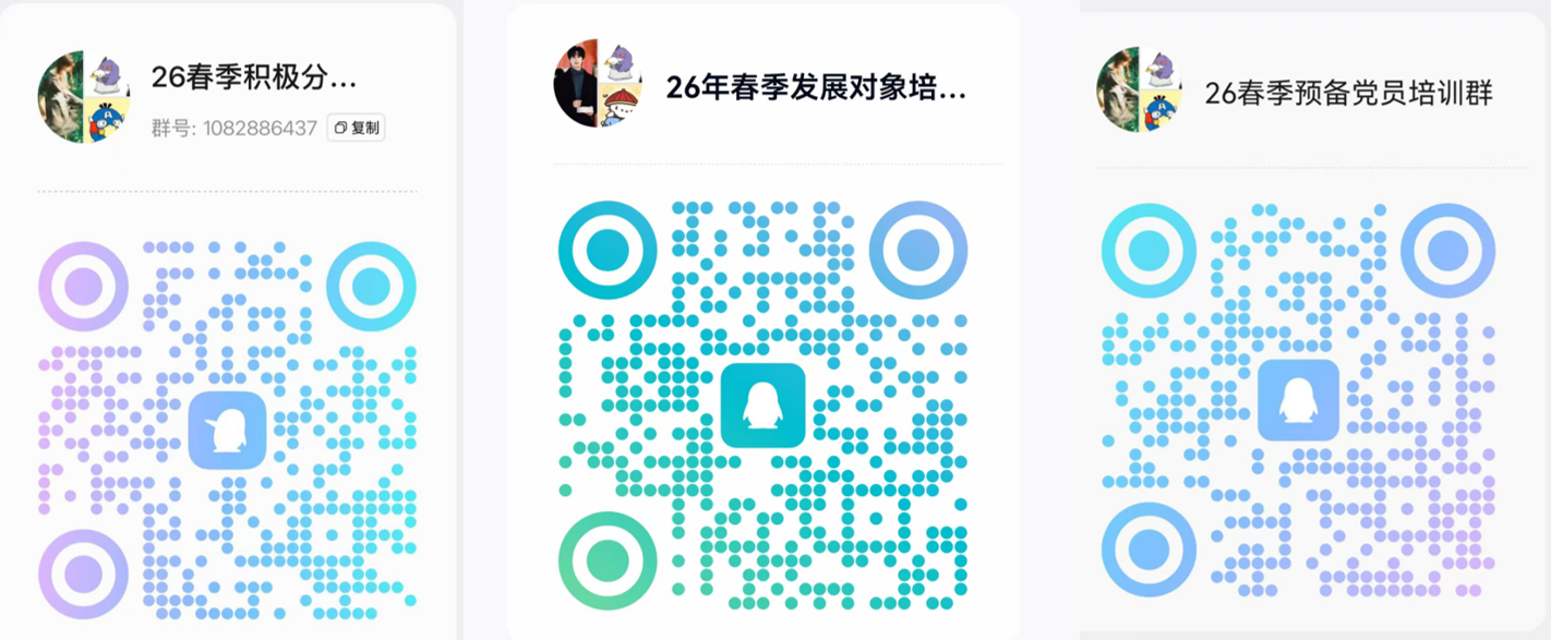 (三)请参加本期入党积极分子、发展对象、预备党员培训的同学于4月15日前加入对应的QQ群,后续通知将在QQ群发布,逾期未加入的同学视作放弃参加培训资格。